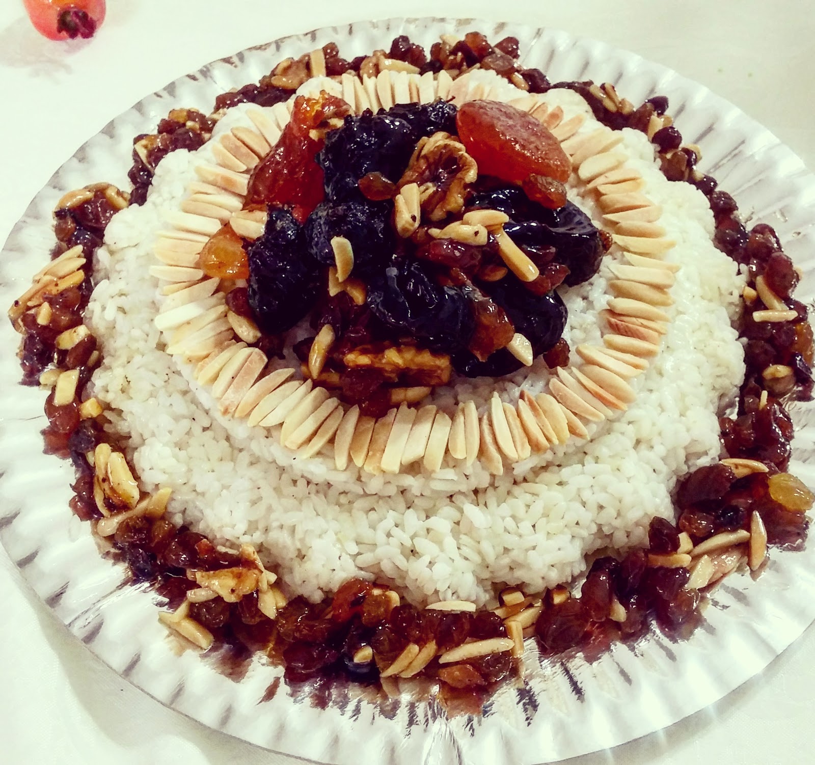 את המנה החגיגית והטעימה הזאת אימי ז"ל הכינה בחגים. את האורז הייתה מעבירה לקערית עמוקה הופכת על מגש מנחושת מדהים ביופיו ומניחה במרכז השולחן. לפני המנה הראשונה היד הייתה מושטת לעבר הפרות היבשים וכשהגיעה המנה העיקרית לא נישאר כלום רק האורז עירום, כמובן שהיא הכינה כמות גדולה מראש!!!
