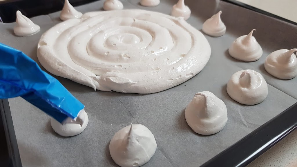 2. מרפדים תבנית אפייה של התנור בנייר אפייה, מעבירים את המרנג לשקית זילוף חותכים את הקצה מזלפים עיגול בקוטר 26 ס"מ ונשיקות מהשאר(ראו בתמונות).