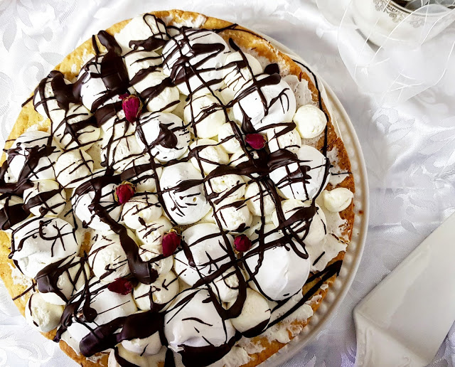 1. מניחים עיגול בצק מזלפים בצורה חופשית קרם גבינה. מניחים מעל עיגול מרנג, מורחים מעט מהקרם ומניחים עוד עיגול בצק. מורחים עוד מעט מהקרם מניחים נשיקות מרנג ומזלפים תלוליות בקרם שנותר.