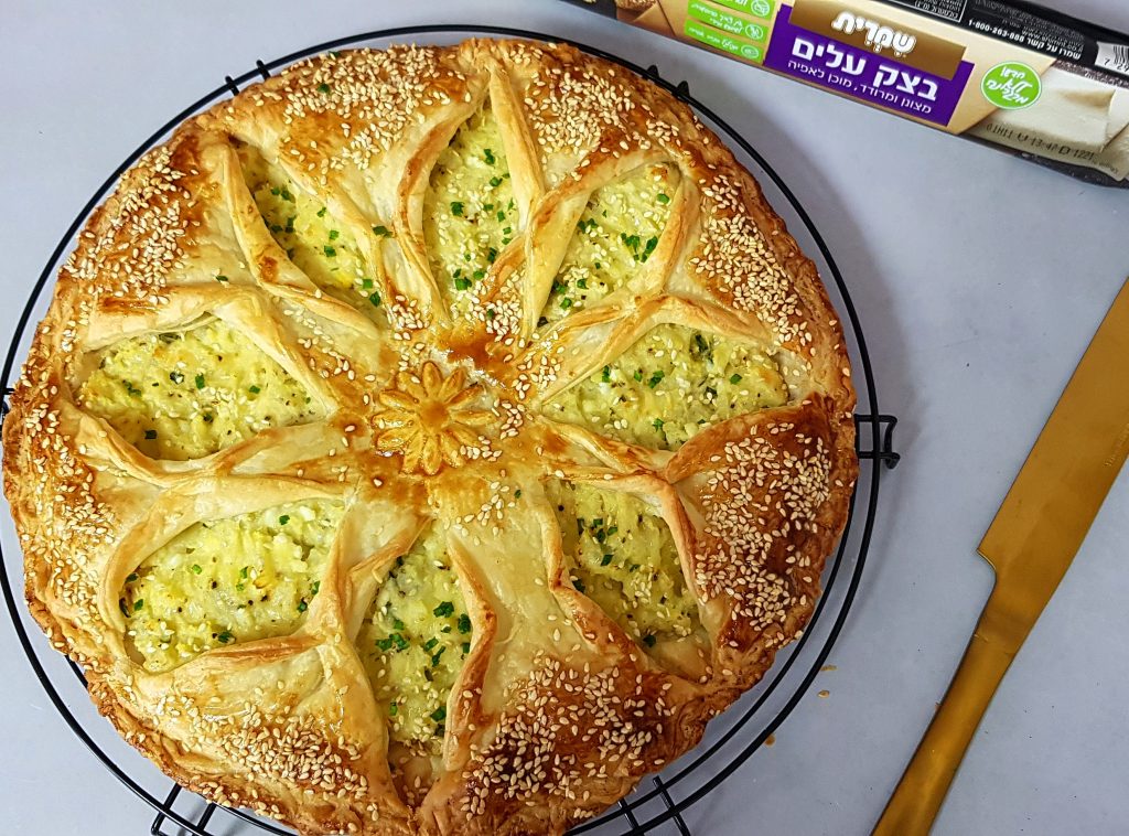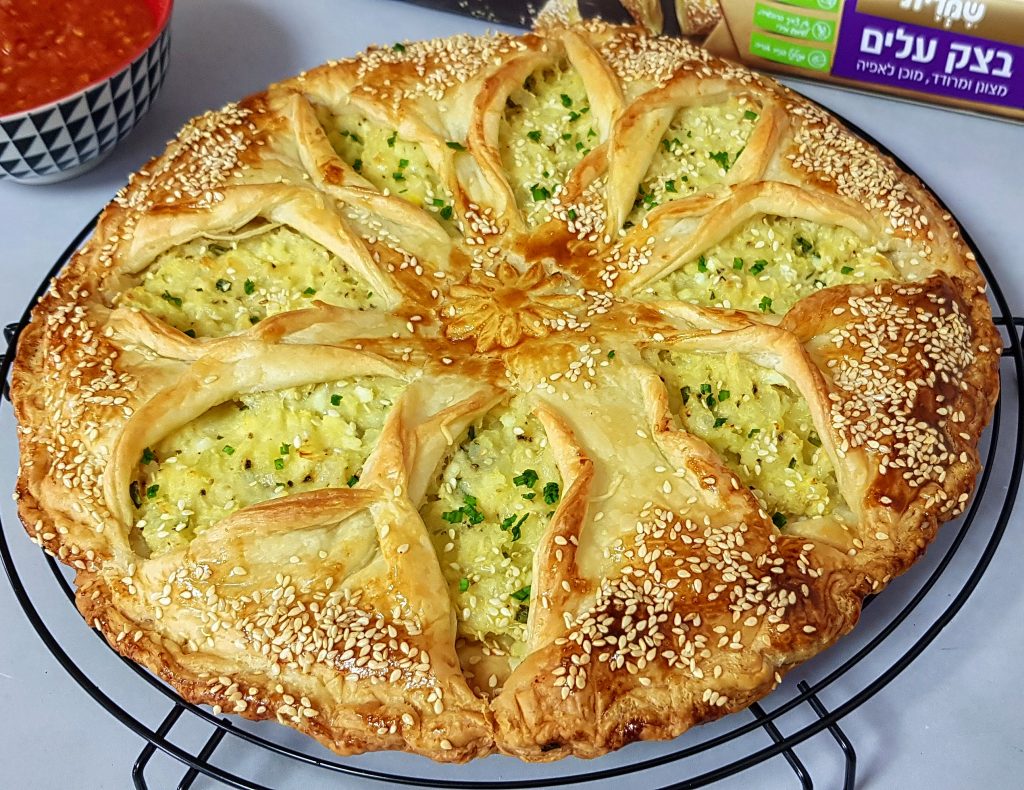 פרח גבינות ותפוחי אדמה-את ההשראה לצורה המיוחדת של הבצק ראיתי באינסטגרם בדף של הבלוגרית הנפלאה elna formigoni שמכינה דברים נפלאים ומיד שלפתי בצק עלים מצונן של שמרית מהמקרר, השתמשתי בשתי חבילות..מחסלים את החמץ!!! קרצתי עיגול בקוטר 28 ס"מ הכנתי מלית עם תפוחי אדמה גבינה צהובה או פטה גבינה לבנה עירית, ביצים קשות מלח פלפל שחור תוך כמה דקות המאפה החגיגי כבר היה בתנור.