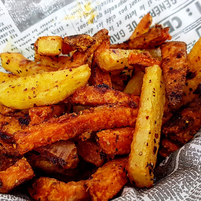 1. מחממים תנור ל-200 מעלות. קולפים את הבטטות וחותכים לגפרורים עבים בצורת צ'יפס. מכניסים לשקית, מוסיפים את הקורנפלור, סוגרים היטב ומשקשקים עד שכל הקורנפלור מתפזר באופן שווה ועוטף את גפרורי הבטטה.